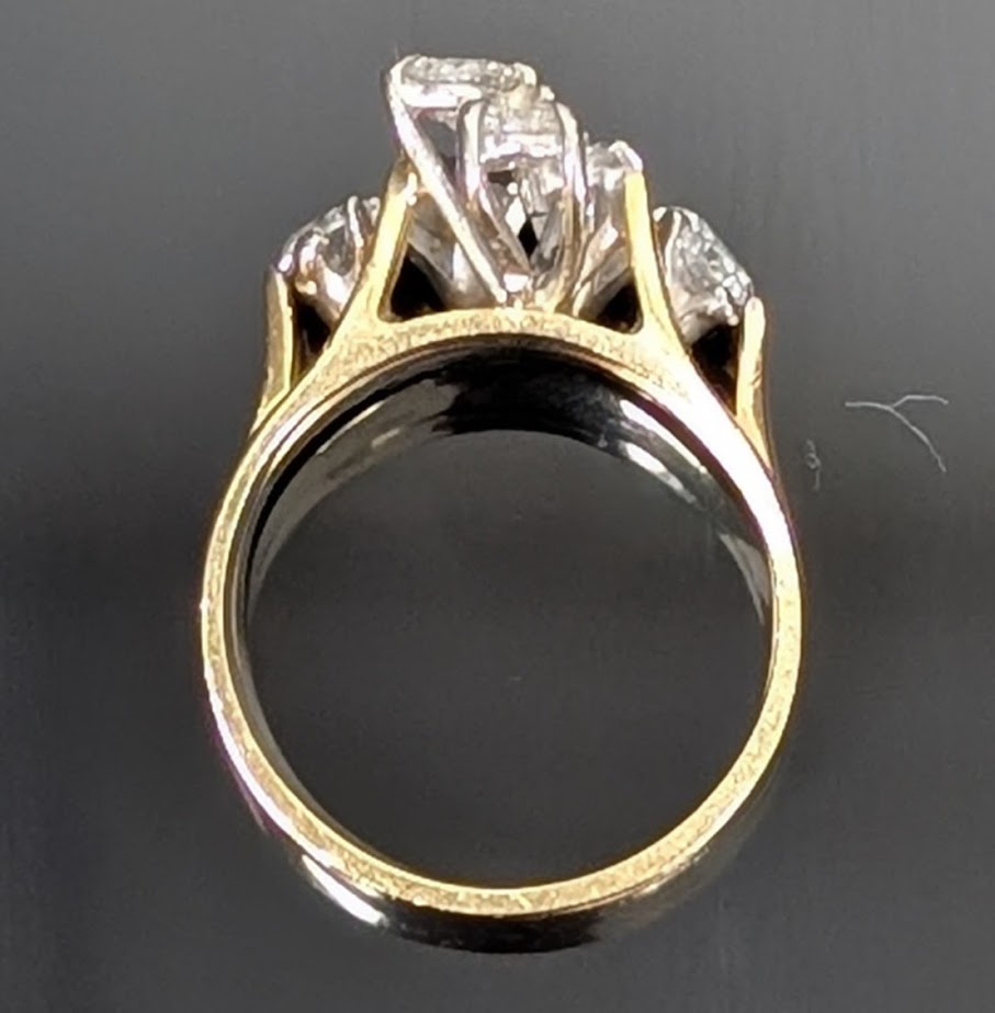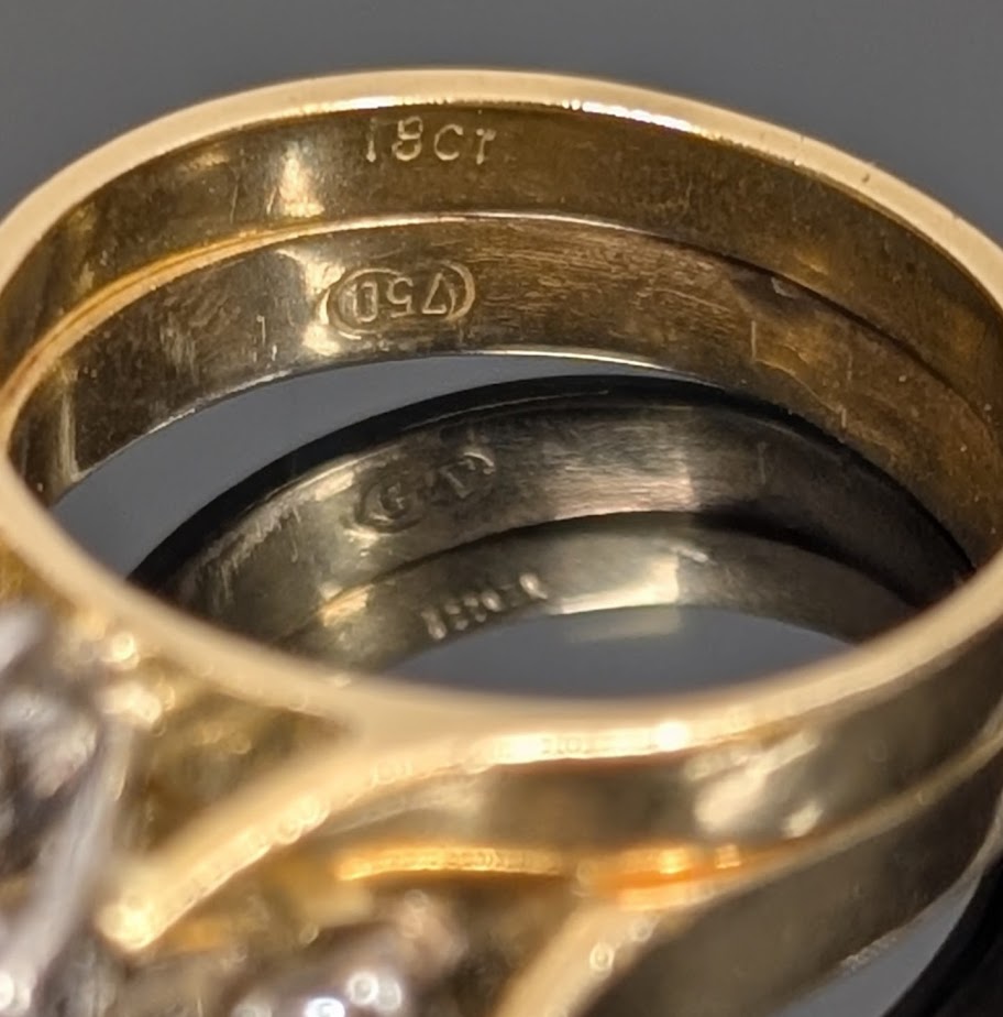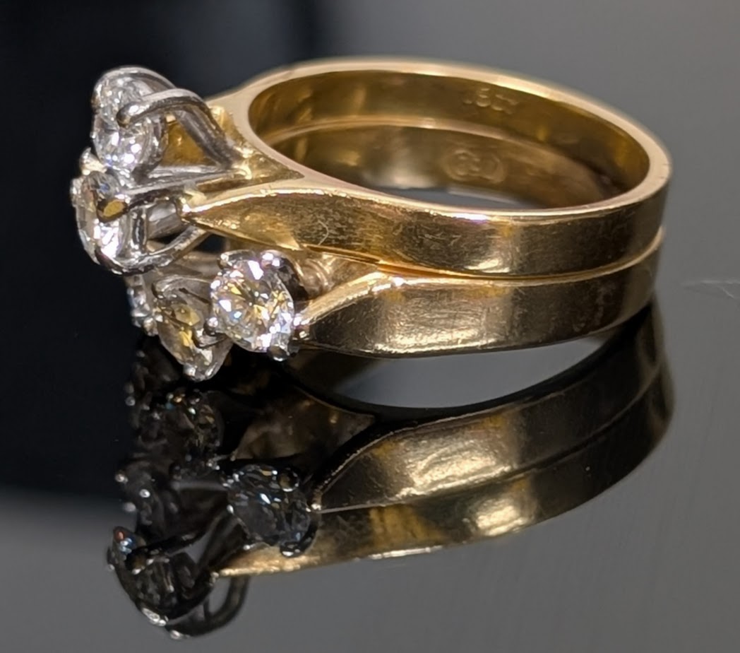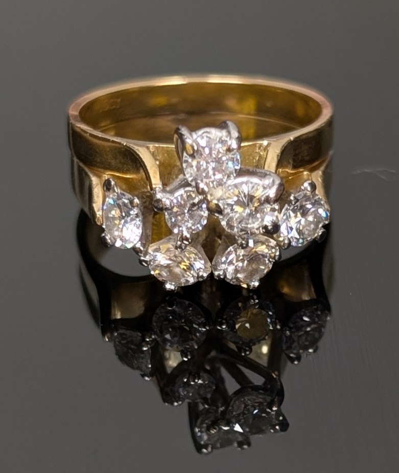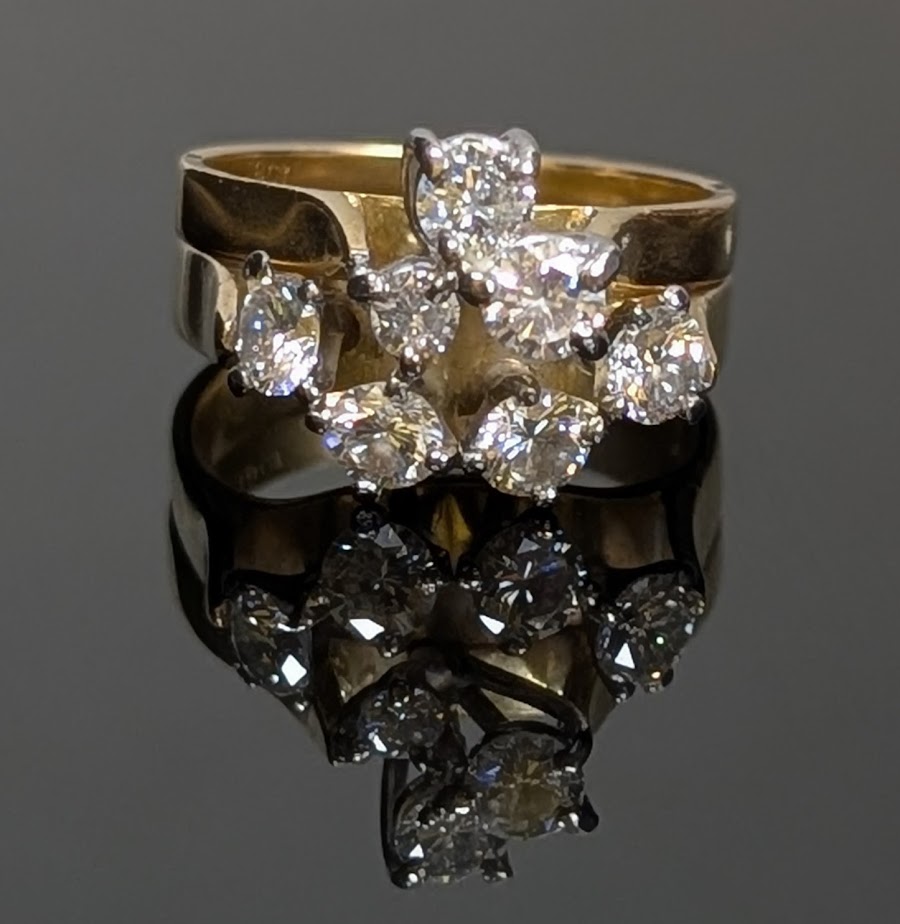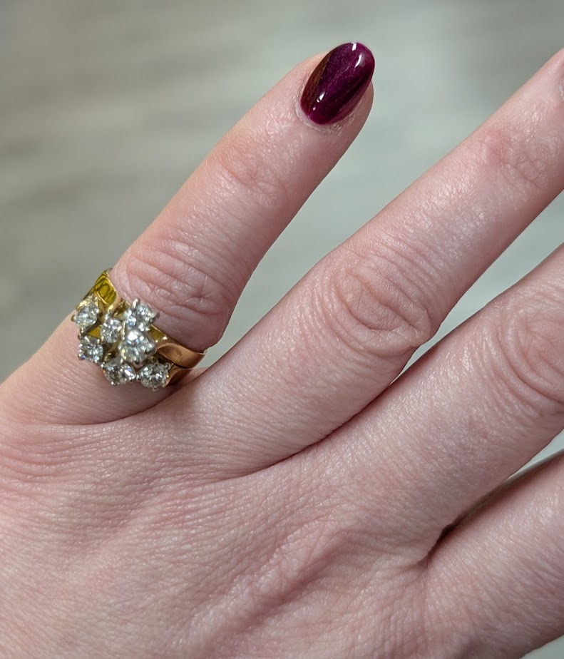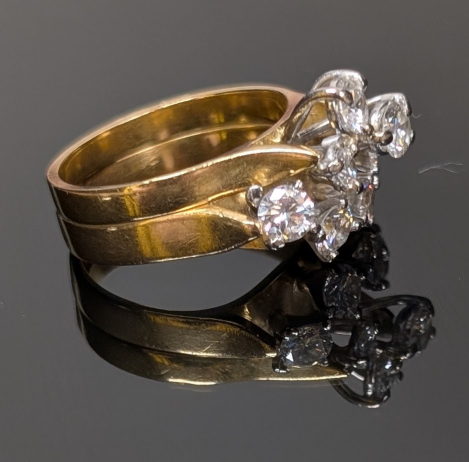 Stunning vintage style, multi diamond cluster, paired with matching gold bands (two soldered together) creates a bold, dimensional look, very classic of mid 20th century designs!