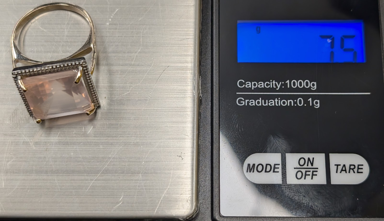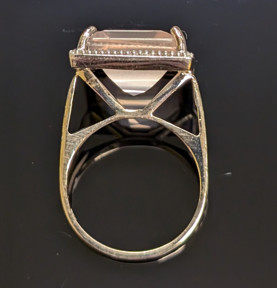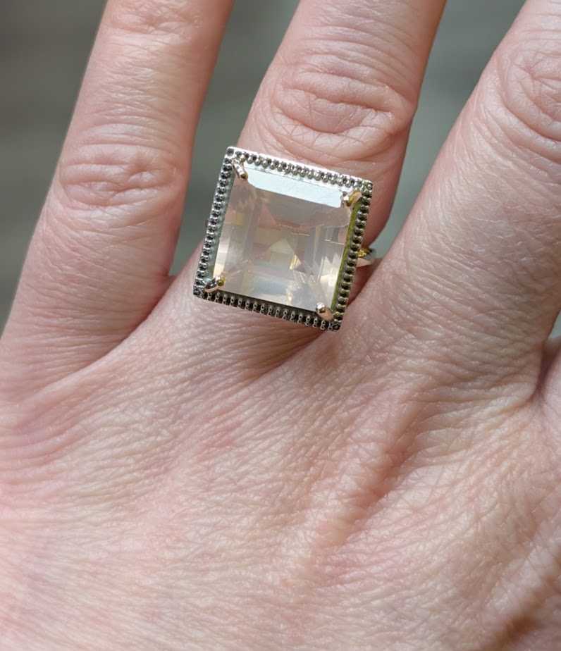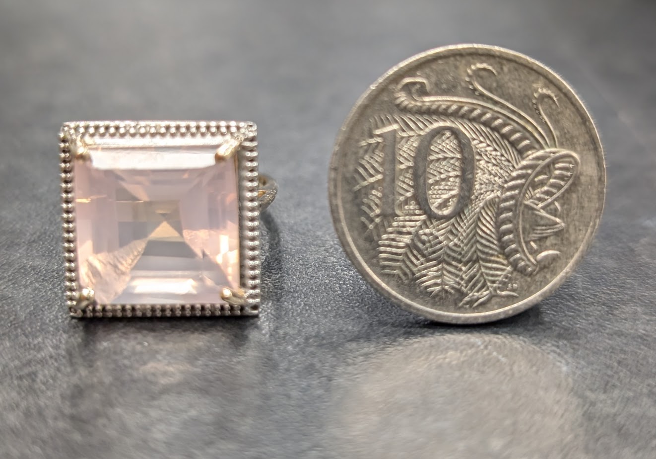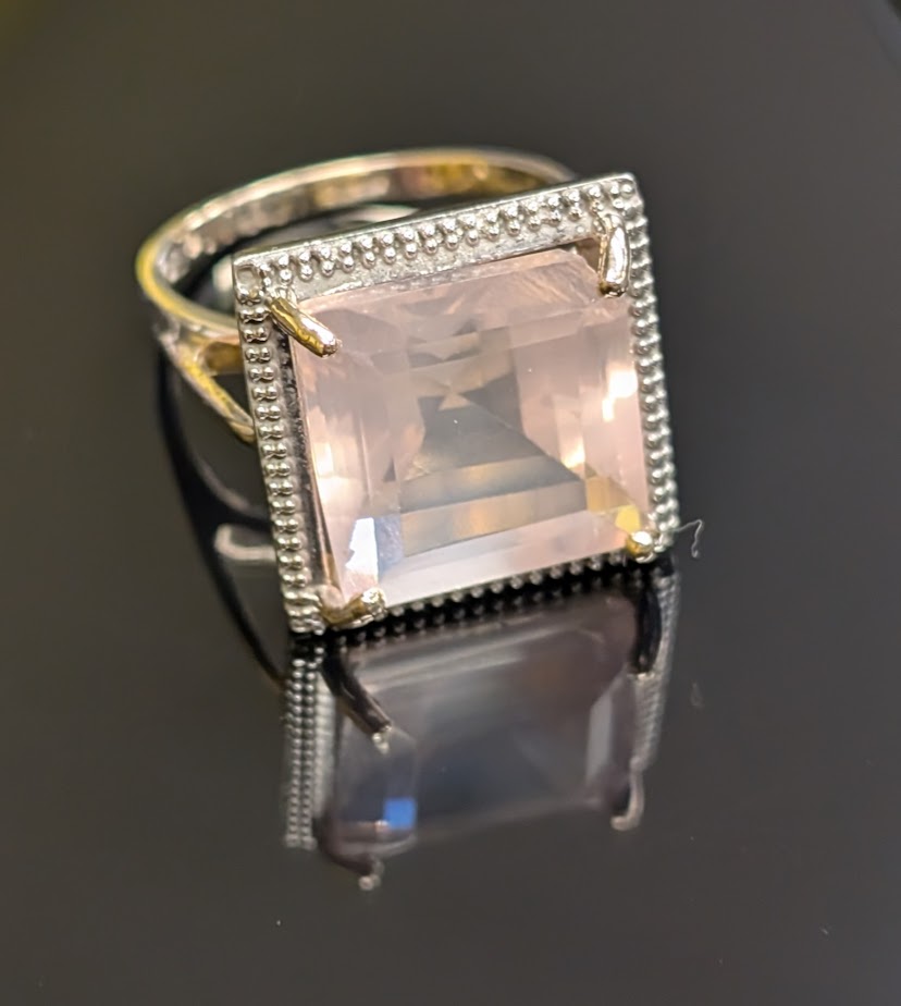 Stone: Large pink square stone in a claw setting (we are unable to test the stone – it could be rose quartz)